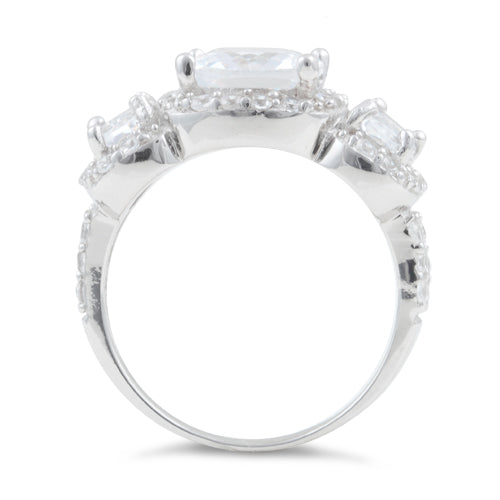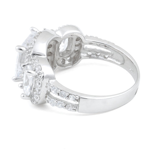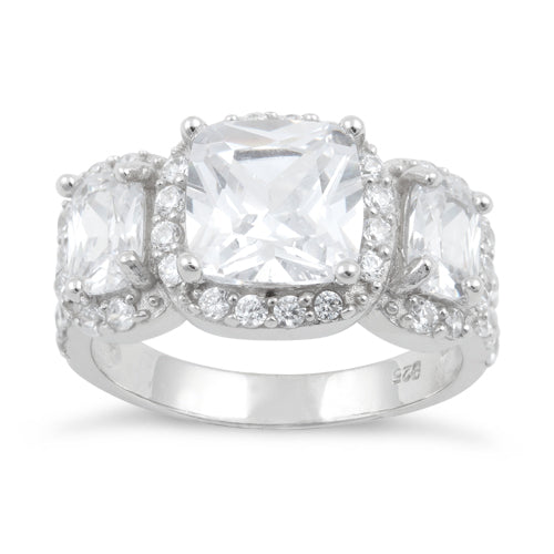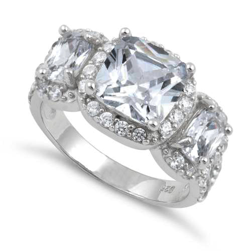 Sterling Silver Clear Three Stone Halo Engagement CZ Ring