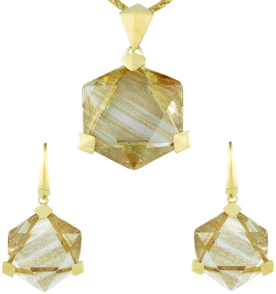 This handcrafted stylish Sterling Silver Gold Plated Hexagonal Rutilated Gold Dust Set is exceptionally high quality. The luminous Sterling Silver has been crafted to create a very elegant look! Embellish your beautiful ears and neck with this fine piece! ***Chain Not Included***
