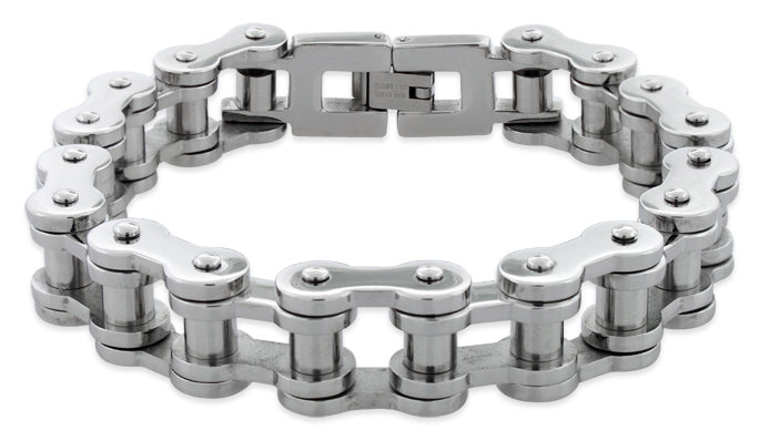 This is a Stunning, Stainless Steel Thick Motorcycle Chain Bracelet. This very unique Bracelet is crafted out of Stainless Steel in a unique pattern. This Bracelet is especially well-made. Don't be fooled by our low price! This Bracelet is top quality and retails for much much more in stores! By importing directly from the source we are able to offer this magnificent bracelet at a tremendous discount.