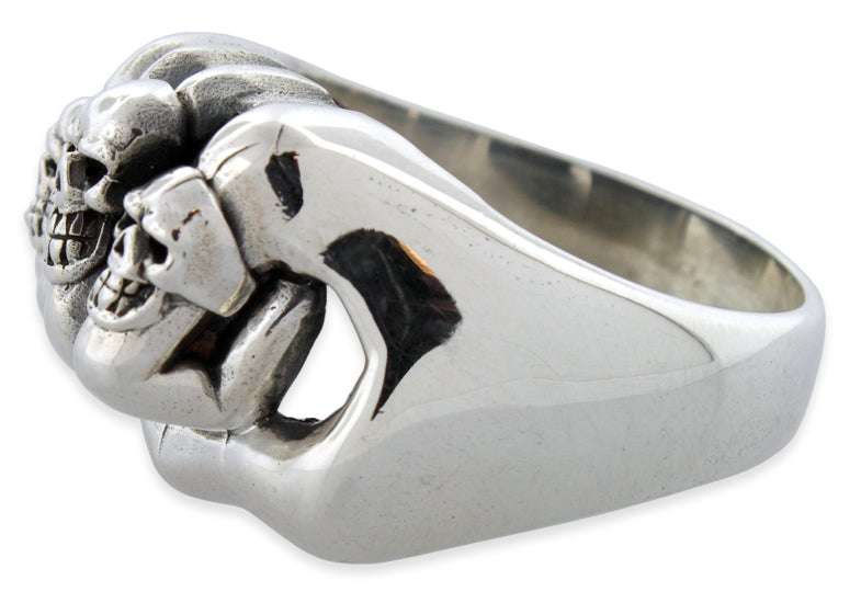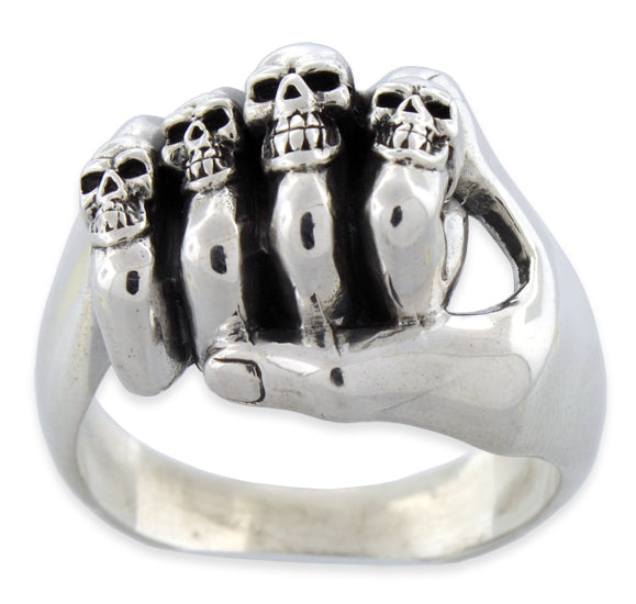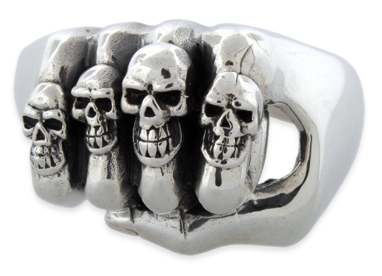 I love the design, however the sharp edges cut into my finger. I bought the silver pilot skull and the back is fully formed and flush. The fist skulls are hollowed out and therefore uncomfortable. For this reason I don't wear it often.