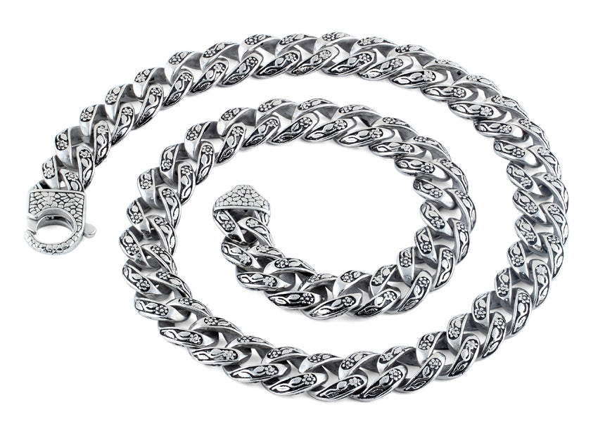 Stunning hand-crafted Stainless Steel Flower Etched Curb Necklace. Intricately designed Sterling Silver creates a very unique and elegant look! Embellish your beautiful finger with this piece!