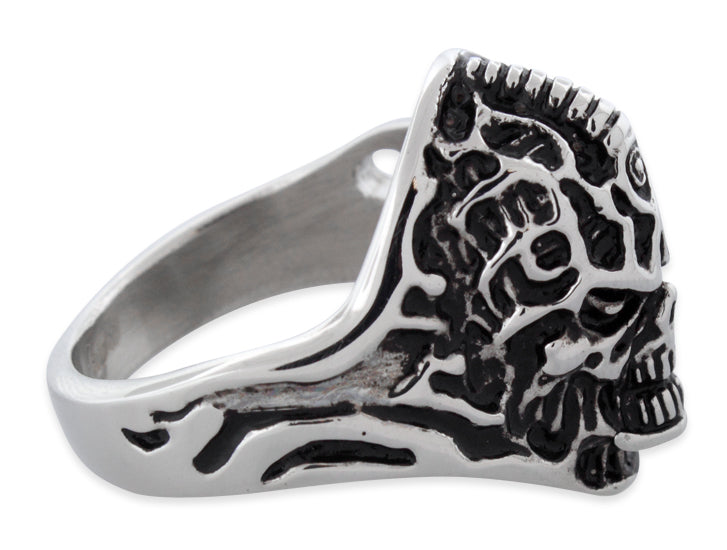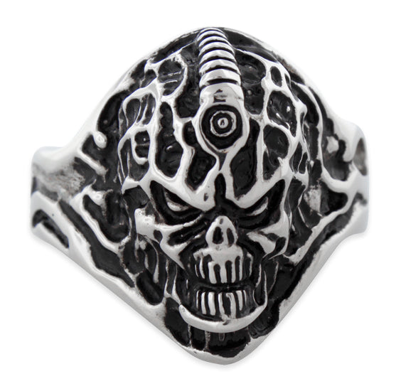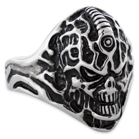 This solid skull ring is made of Surgical Stainless Steel, hand crafted with the Finest Detail giving it a very Masculine and Dark look. This heavy ring is a depiction of an exhumed skull with crazy designs all over it's face which continue along the head. Add this manly piece to your collection and see just what kind of attention you will get. Don't be fooled by our low price! This ring is top quality and retails for much much more in stores! By importing directly from the source we are able to offer this magnificent ring at a tremendous discount. Sizes 15, 16, 17, and 18 are special order and are non-refundable. Please add 2 to 3 business days to expected delivery time for these sizes.